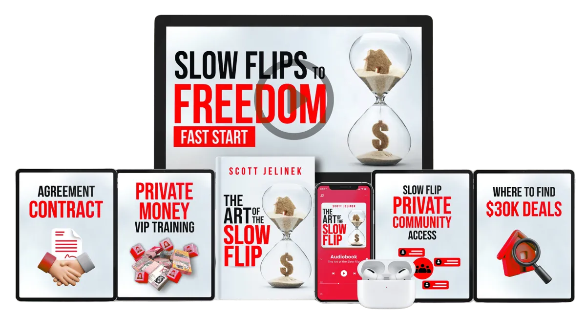 A 9-module video program paired with a 200+ page book that shows you how to retire early with $875-1200/mo income generating Slow Flips.